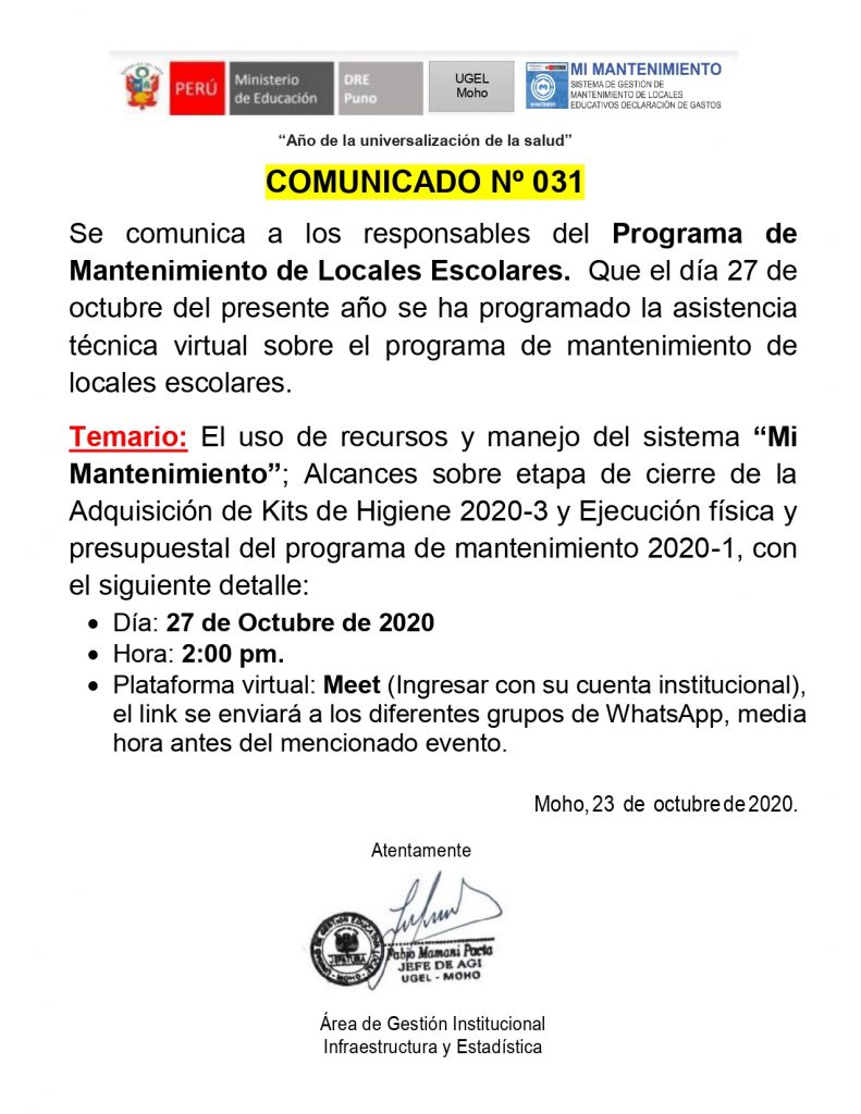 COMUNICADO Nº 031 PROGRAMA DE MANTENIMIENTO DE LOCALES ESCOLARES