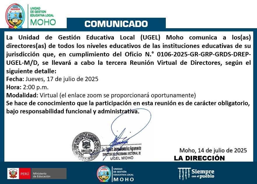 COMUNICADO PARA TODO LOS DIRECTIVOS DE TODOS LOS NIVELES DE LA UGEL-MOHO