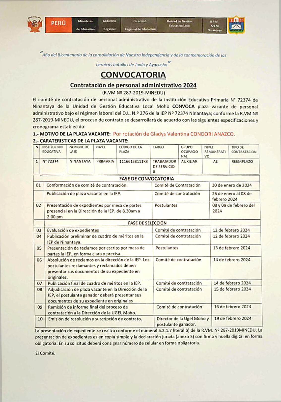 IEP N°72374 DE NINANTAYA – TRABAJADOR DE SERVICIO II