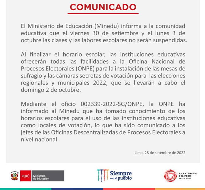 EL MINISTERIO DE EDUCACION (MINEDU) INFORMA A LA COMUNIDAD EDUCATIVA